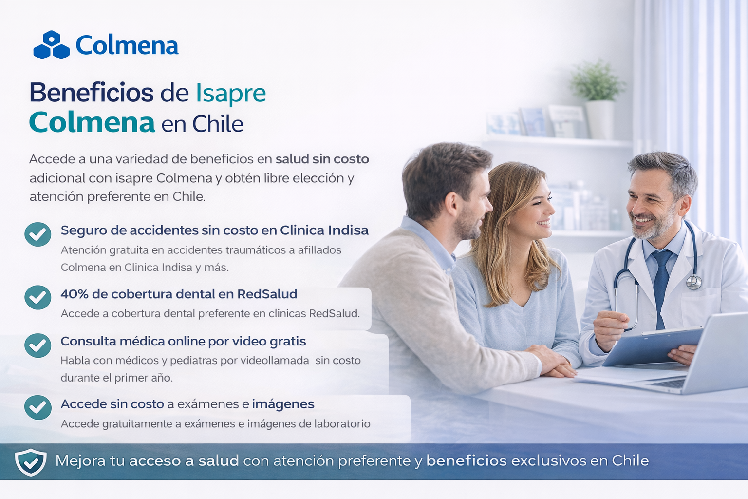 Sus planes están orientados a personas y familias que buscan seguro de salud en Chile, incluyendo beneficios en consultas, exámenes, hospitalización y atención de urgencia. Colmena se posiciona como una de las isapres en Chile con mayor trayectoria, destacando por su experiencia, cobertura y calidad de servicio.