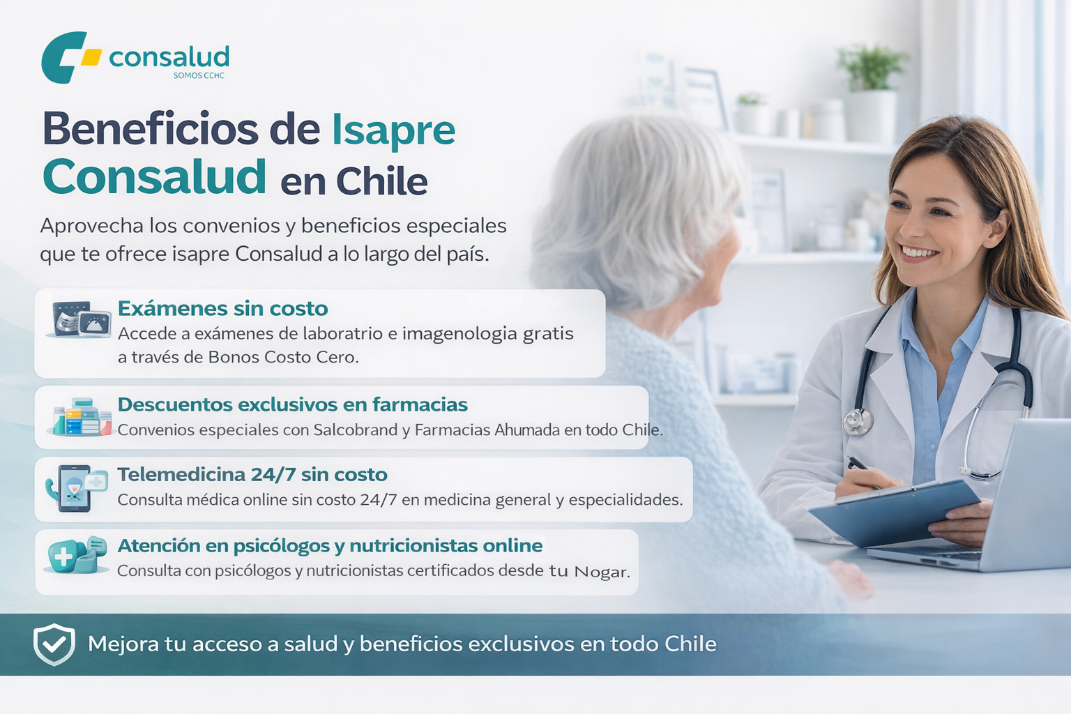 Isapre Consalud Chile ofrece planes de salud privados con cobertura completa, ideales para quienes buscan protección, seguridad y acceso a una red de clínicas de primer nivel. Con múltiples opciones de seguro de salud, permite elegir planes flexibles que incluyen beneficios en consultas médicas, exámenes, hospitalización y urgencias.