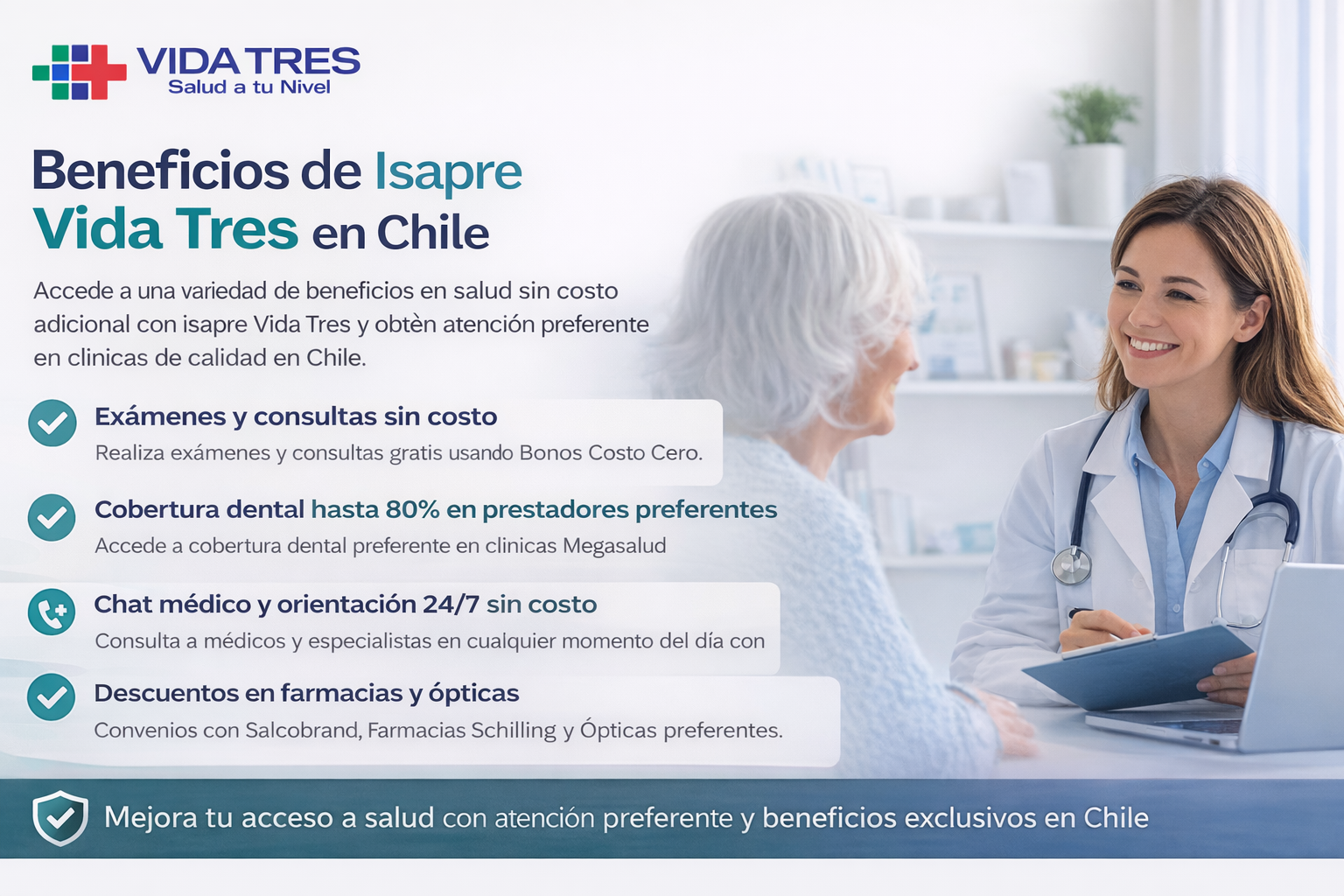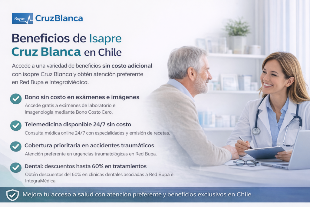 Isapre Cruz Blanca Chile ofrece planes de salud con cobertura completa, pensados para quienes buscan protección, tranquilidad y acceso a una red de salud de primer nivel. Sus alternativas de seguro de salud privado incluyen beneficios en consultas médicas, exámenes, hospitalización y programas preventivos.