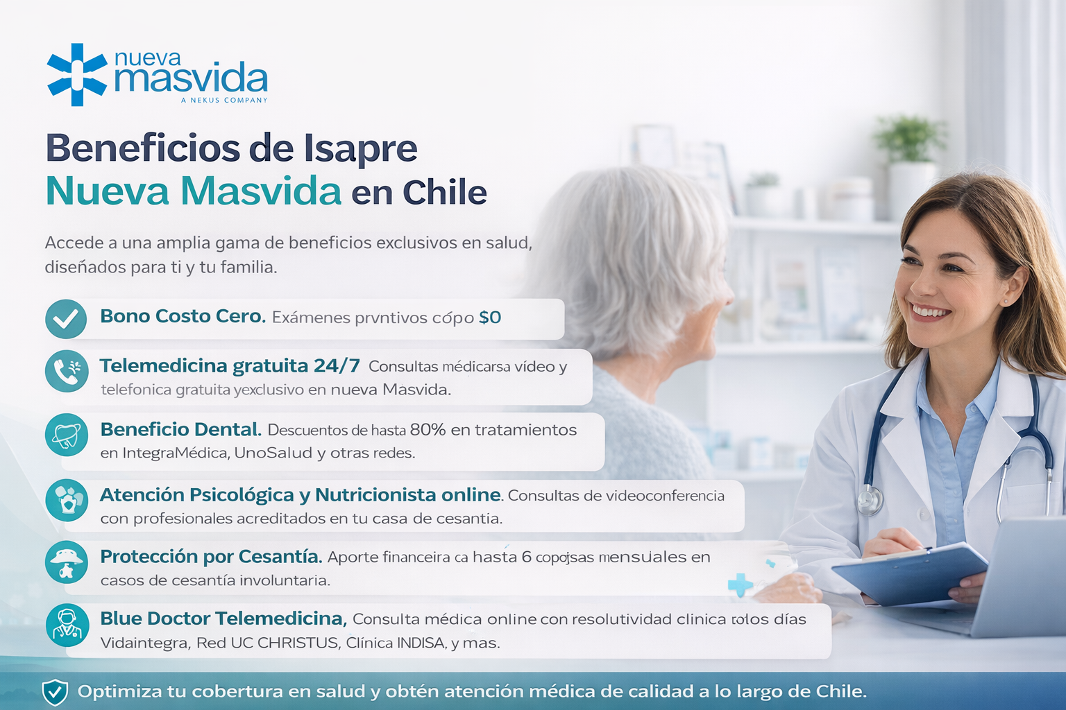 Isapre Nueva Masvida es una institución de salud previsional chilena que proporciona soluciones de aseguramiento en salud mediante una variedad de planes orientados a la cobertura médica integral. Cuenta con una extensa red de prestadores y convenios a nivel nacional, permitiendo el acceso a servicios de salud oportunos y de calidad.
